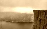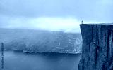 Preikestolen, Norway, A hiker stands on the edge of a cliff with arms outstretched,