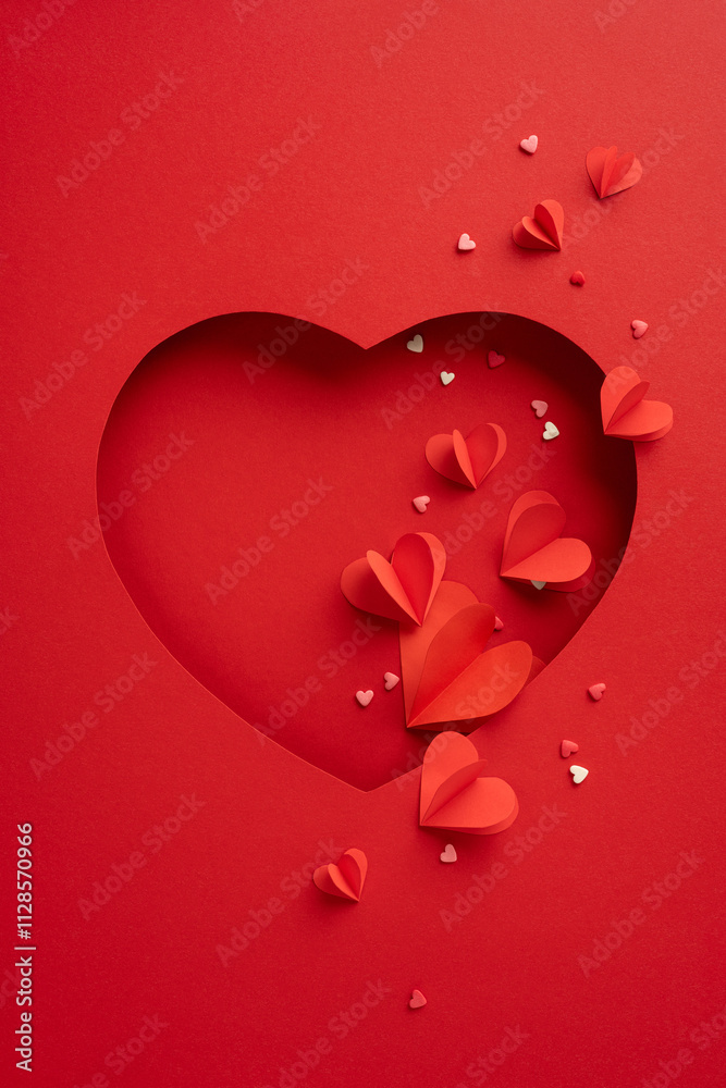 A vertical collection of paper hearts decorates a red background with a heart cut-out, symbolizing love and romance. Perfect for Valentine's Day celebrations and love-themed designs