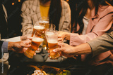 A cheerful group of young adults enjoys a lively night out, raising glasses in a celebratory toast. Laughter and smiles fill the air as friends bond over drinks in a vibrant social gathering.