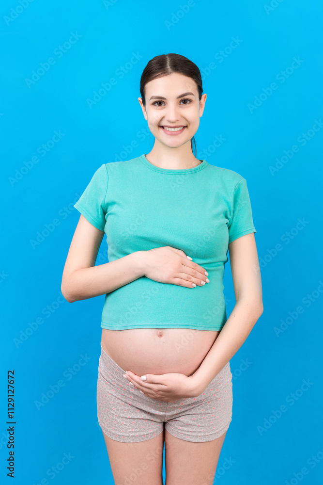 Happy pregnant woman touching her abdomen at Colored background. Future mother is wearing white underwear. Expecting of a baby. Copy space