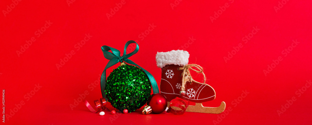 Christmas ball with skates on colored background. decoration bauble with ribbon bow with copy space