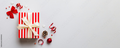 Top view Flat lay Christmas decorations and gift box on colored background with copy space. Christmas or Happy New Year composition