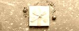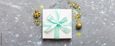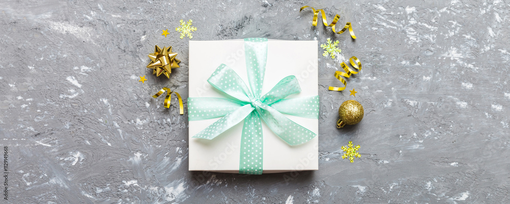 Top view Flat lay Christmas decorations and gift box on colored background with copy space. Christmas or Happy New Year composition