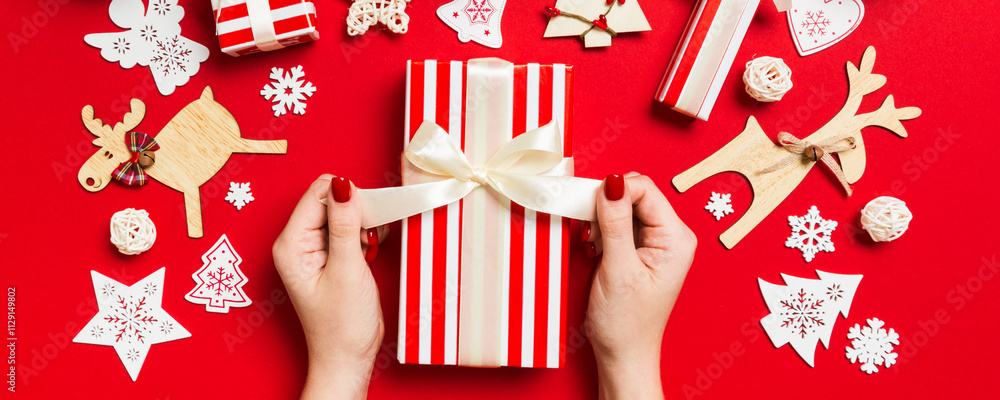Top view of female hands holding a Christmas present on festive red background. Holiday decorations. New Year holiday concept