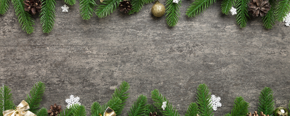 Christmas background with fir branches and Christmas decor. Top view, copy space for text