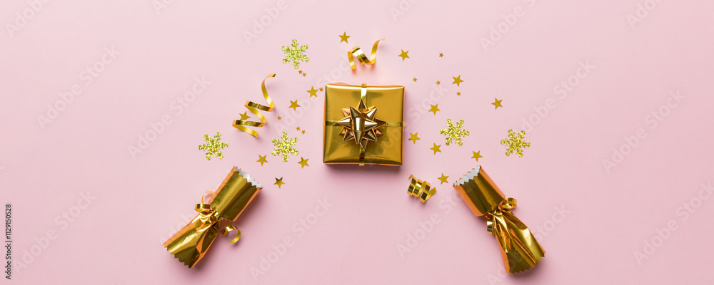 Christmas crackers with shiny confetti on color background, top view, copy space