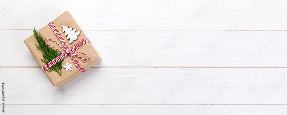 Christmas gift box wrapped in recycled paper, with ribbon top view with copy space on rustic background. Holiday concept