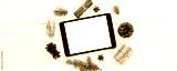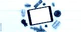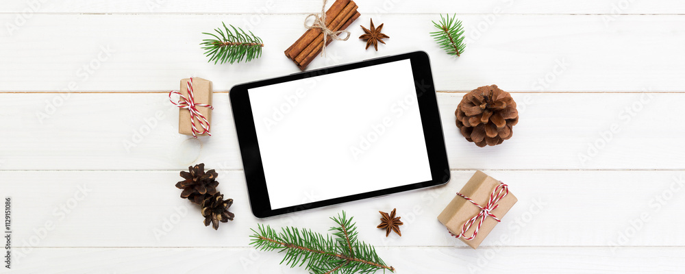 Digital tablet mock up with rustic Christmas wooden background decorations for app presentation. top view with copy space