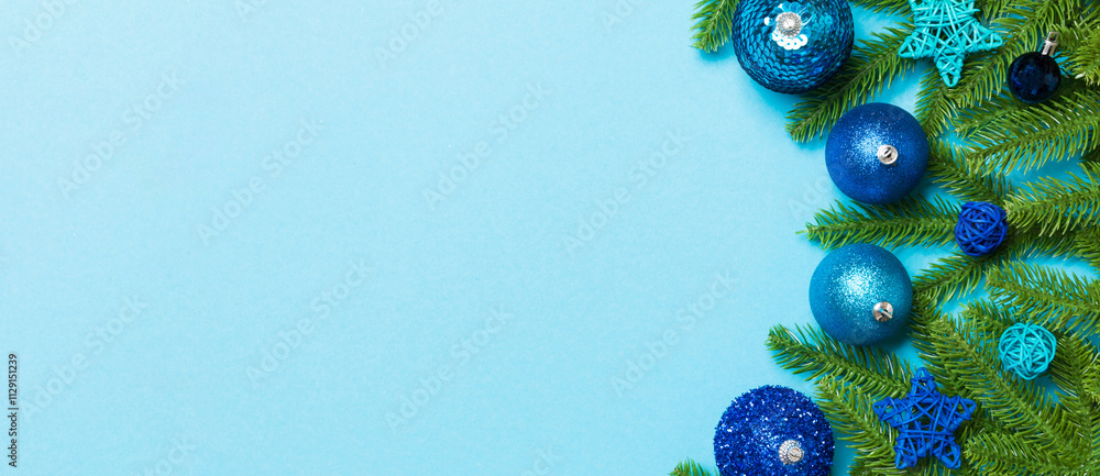 Set of festive balls, fir tree and Christmas decorations on colorful background. Top view of New Year ornament concept with copy space