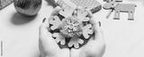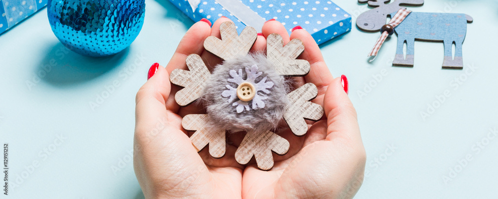 Top view of snowflake in female hands on blue background. Christmas decorations. New Year holiday concept