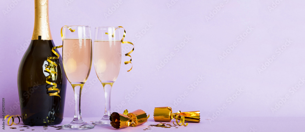 Champagne bottle with confetti, glasses and christmas decor on colored holiday background. Flat lay New Year decorations