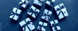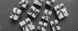 Colored craft gift boxes with colorful ribbons on colored background. Collection of Christmas present boxes