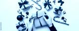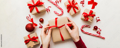Woman is packing surprise gift for Christmas holidays, sitting at workplace with craft tools, top view. Woman wrapping Christmas gift at colored table