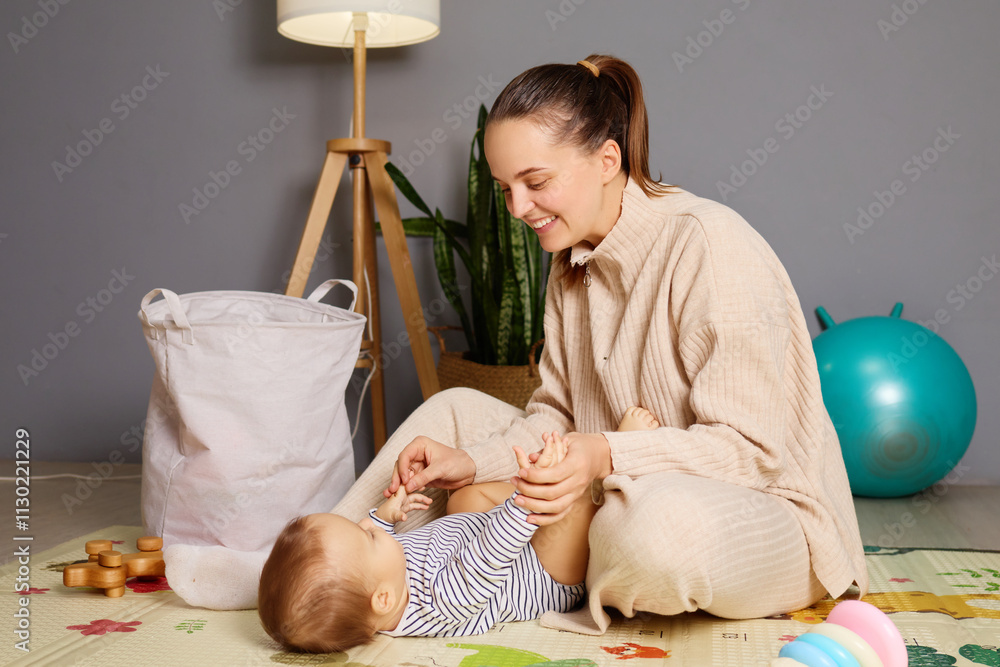A mother interacts lovingly with her baby on a vibrant play mat. The room is well-lit, featuring plants and a cozy atmosphere, creating a warm environment for bonding