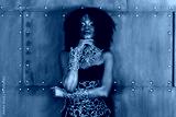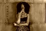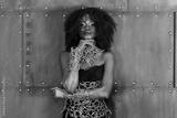 Thoughtful young African woman in gold makeup and accessories holding hand on chin, looking at camera