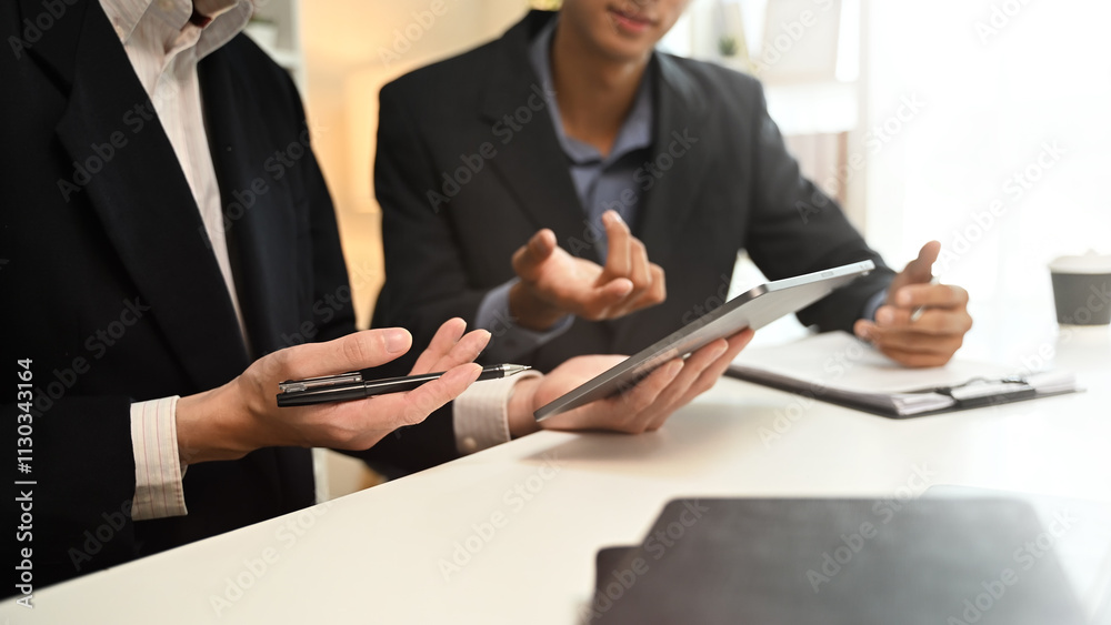 Financial advisor and client in a discussion using digital tablet to review plans and strategies.