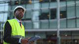 Architect inspecting building using digital tablet and wearing safety vest and helmet