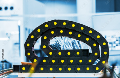 A black cable carrier, a drag chain, designed for industrial applications. The carrier is formed of modular, interlinked plastic segments each link for easy assembly or maintenance.