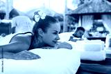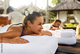 Romantic Couple Spa. Closeup Of Beautiful Healthy Happy Smiling Woman, Handsome Man Relaxing At Day Spa Resort. People Enjoying Body Relaxation Massage Outdoors In Summer. Relax Treatment Concept