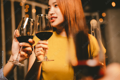 A fun celebration of friends sharing champagne and wine over a festive holiday dinner. People laugh together, show elegance, and stay together, celebrating the special occasion over drinks.