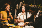 A lively gathering of friends celebrating with glasses of wine raised in a joyful celebration, smiling and enjoying red wine and champagne, sharing happiness, laughter and togetherness on a night of c