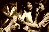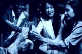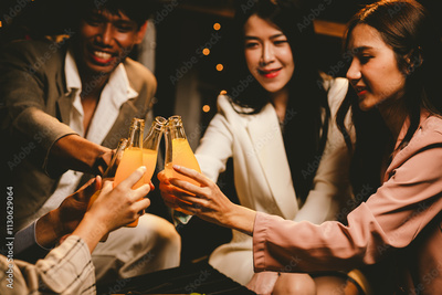 A lively group of young friends celebrates, clinking glasses of beer together in a joyful manner. They chat and smile happily amidst the bustling nightlife and camaraderie.