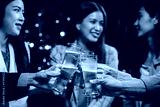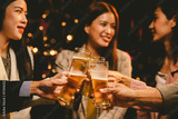 Friends clink glasses of beer at a simple dinner party.