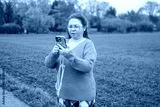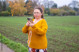 Mature positive white woman with long hair and yellow sweater using modern smartphone outdoors, surrounded by greenery and nature's beauty