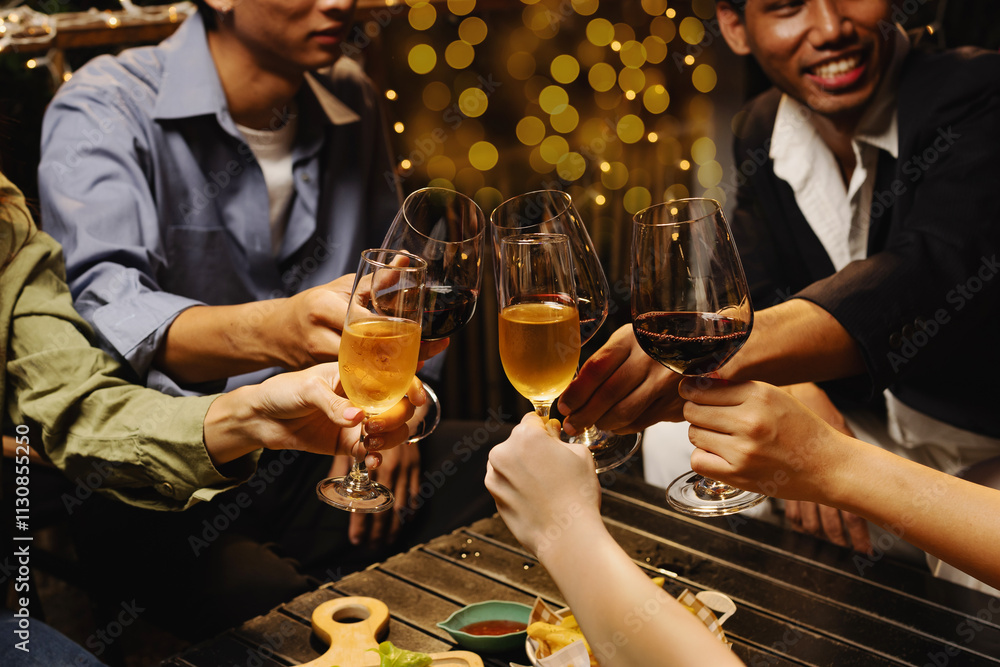 Group of friends clinking wine glasses in celebration at night, Festival celebration, Happy Asian group friends and dinner party in the night, Friendship and celebration new year concept.