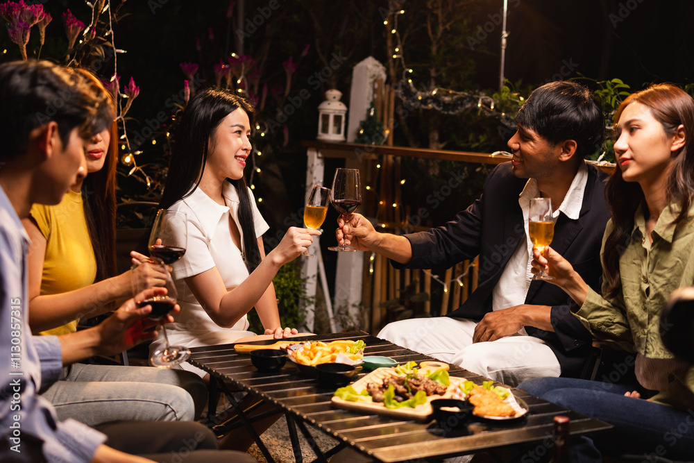 Group of friends clinking wine glasses in celebration at night, Festival celebration, Happy Asian group friends and dinner party in the night, Friendship and celebration new year concept.