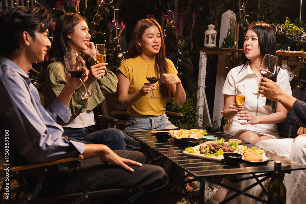 Group of friends clinking wine glasses in celebration at night, Festival celebration, Happy Asian group friends and dinner party in the night, Friendship and celebration new year concept.