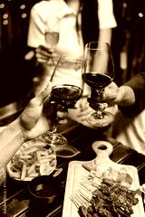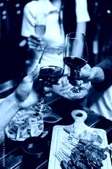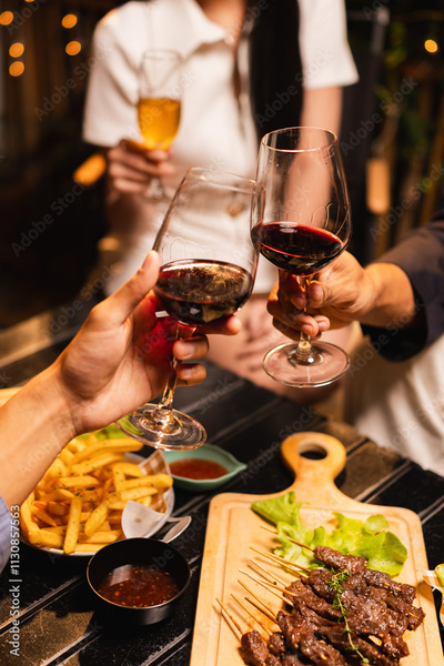 Group of friends clinking wine glasses in celebration at night, Festival celebration, Happy Asian group friends and dinner party in the night, Friendship and celebration new year concept.