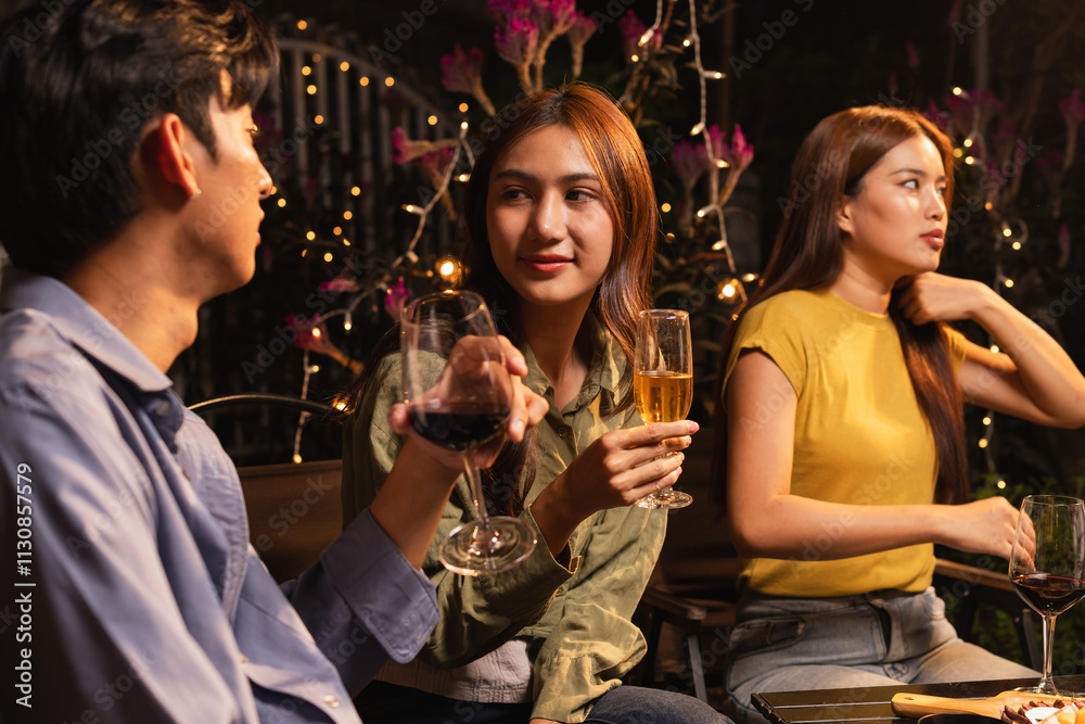 Group of friends clinking wine glasses in celebration at night, Festival celebration, Happy Asian group friends and dinner party in the night, Friendship and celebration new year concept.
