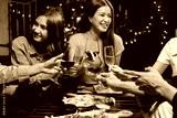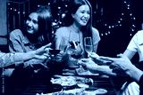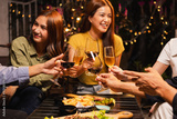Group of friends clinking wine glasses in celebration at night, Festival celebration, Happy Asian group friends and dinner party in the night, Friendship and celebration new year concept.