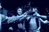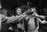 Group of friends clinking wine glasses in celebration at night, Festival celebration, Happy Asian group friends and dinner party in the night, Friendship and celebration new year concept.