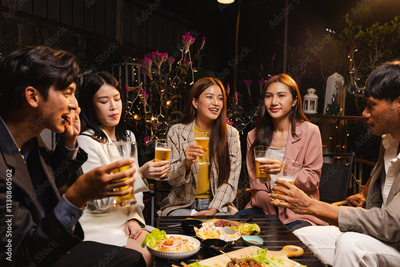 Group of friends clinking beer glasses in celebration at night, Holiday, Festival celebration, Happy Asian group of friends and dinner party in the night, Friendship and celebration new year concept.
