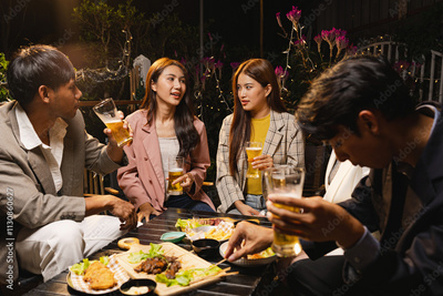 Group of friends clinking beer glasses in celebration at night, Holiday, Festival celebration, Happy Asian group of friends and dinner party in the night, Friendship and celebration new year concept.