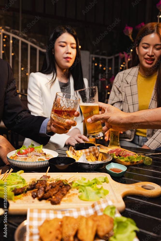 Group of friends clinking beer glasses in celebration at night, Holiday, Festival celebration, Happy Asian group of friends and dinner party in the night, Friendship and celebration new year concept.
