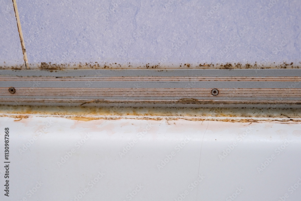 Mold fungus and rust growing in tile joints in damp poorly ventilated bathroom with high humidity, wetness, moisture and dampness problem in bath areas and shower