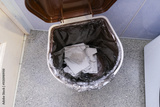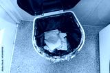 A trash bin with raised cap with used toilet paper, tissue in restroom