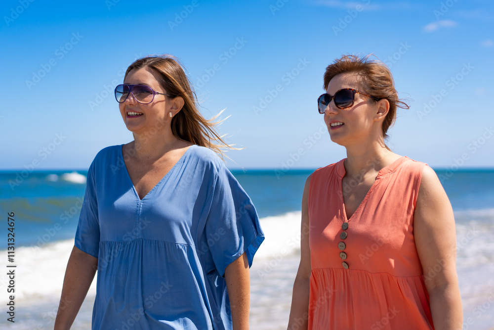 Summer vacations. Portrait of two middle-aged women walking on beach by sea with big waves on beautiful sunny and windy day