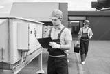 Portrait of male professional electrician engineer or technician wearing overall and safety helmet checking the condition of ventilation system. Maintenance of air conditioners concept.
