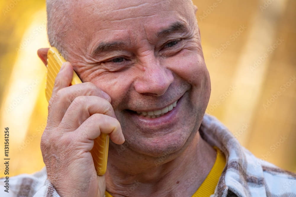 Positive elderly white man 65 years old enjoying technology, senior using modern smartphone, joyful moment surrounded by peaceful nature