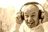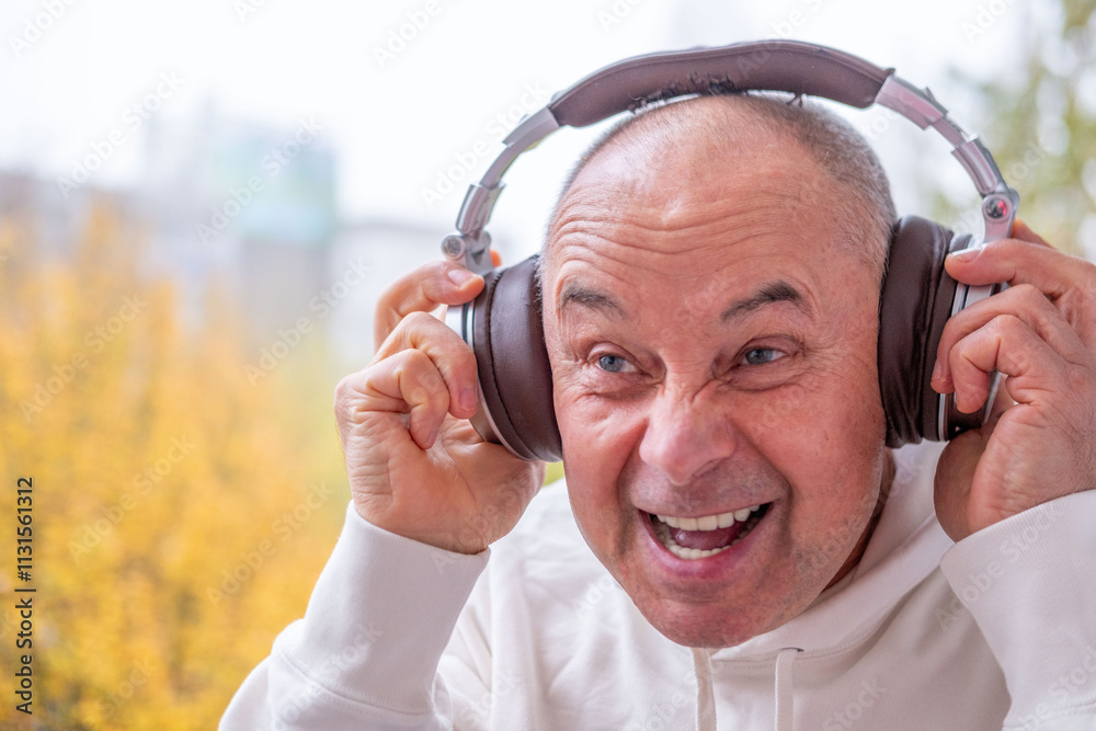 Positive elderly white man 65 years old, Cheerful senior wearing large headphones, learning foreign language or listening to music, enjoying life surrounded
