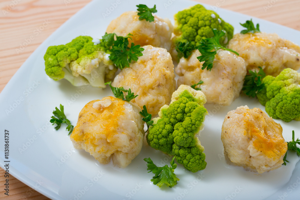Delicious stewed fish balls with white sauce, steamed broccoli and fresh greens ..