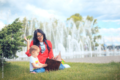 Beautiful mother and kid girl outdoors Happy mother showing her