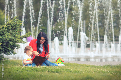 Beautiful mother and kid girl outdoors Happy mother showing her