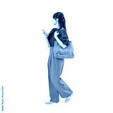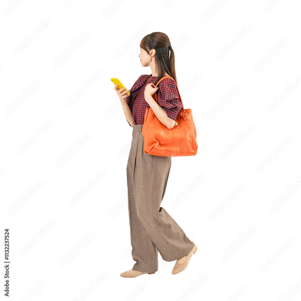 スマホを持って歩くカジュアルウェアの女性 手作業で精密に切り抜いた背景透過全身写真PNG