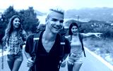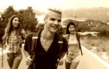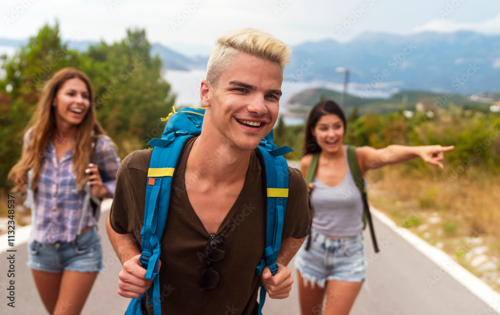 Happy friends on a road trip have fun, piggybacking at the roadside and enjoying summer vacation