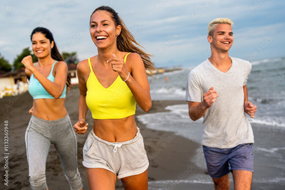 Group running on beach jogging having fun training. Exercising runners training outdoors